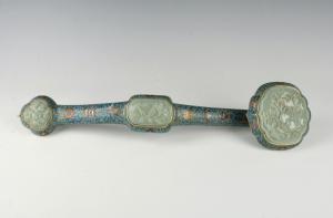 A large, 17-inch-tall cloisonné ruyi (a Chinese amulet in the form of a curved, lobed scepter, one that bestows good wishes for the prosperity of the recipient) has a pre-sale estimate of $3,000-$5,000. It has three carved hardstone plaques on the head, center and bottom, with fruit deigns.