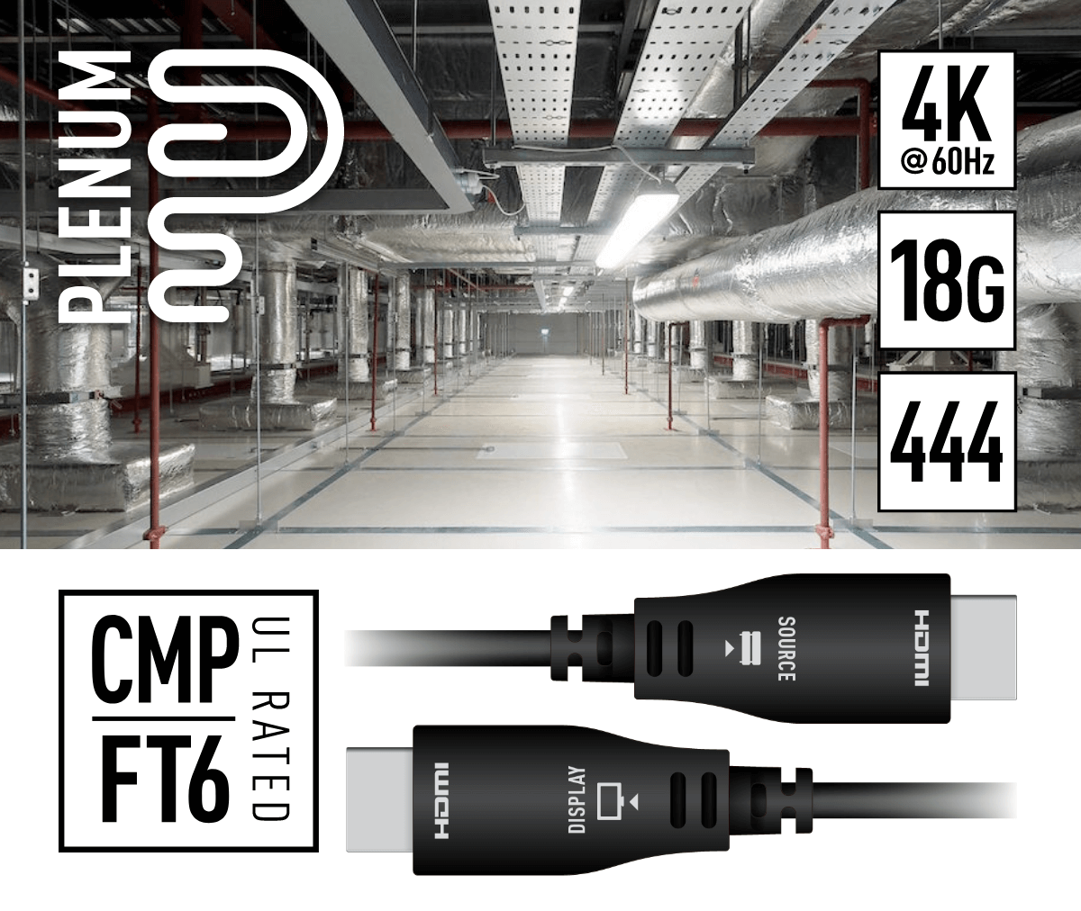Plenum rated active optical HDMI fiber cables enable long-distance HDMI signal extension with no power device required