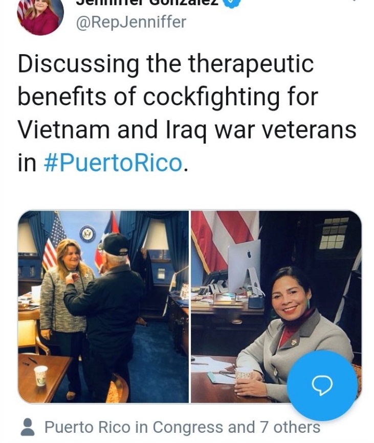 Puerto Rico’s Jennifer Gonzalez Colon, the Commonwealth’s Delegate to Congress, introduced two bills, H.R. 1189 and H.R. 5436, to repeal the animal fighting ban, but it has attracted not a single supporter from House or Senate lawmakers, except the Delegates from the other territories.