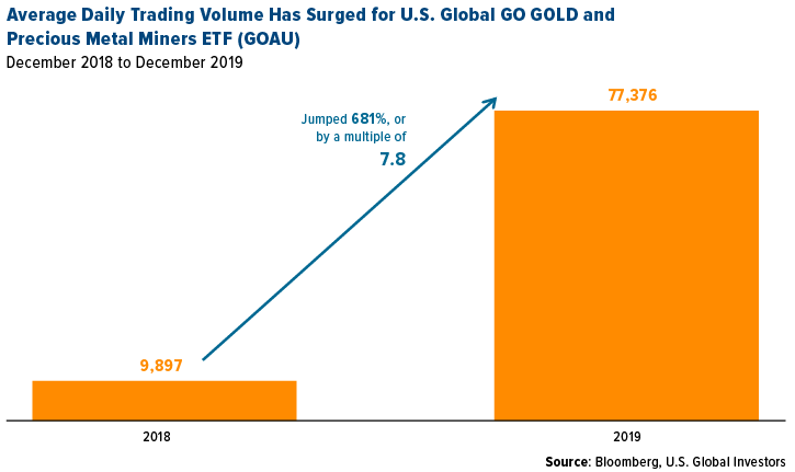 Besides delivering stellar performance, GOAU has seen its trading volume surge over the past 12 months. Between December 2018 and December 2019, average daily trading volume jumped 681 percent, or by a multiple of 7.8, from 9,897 shares to as many as 77,376 shares.