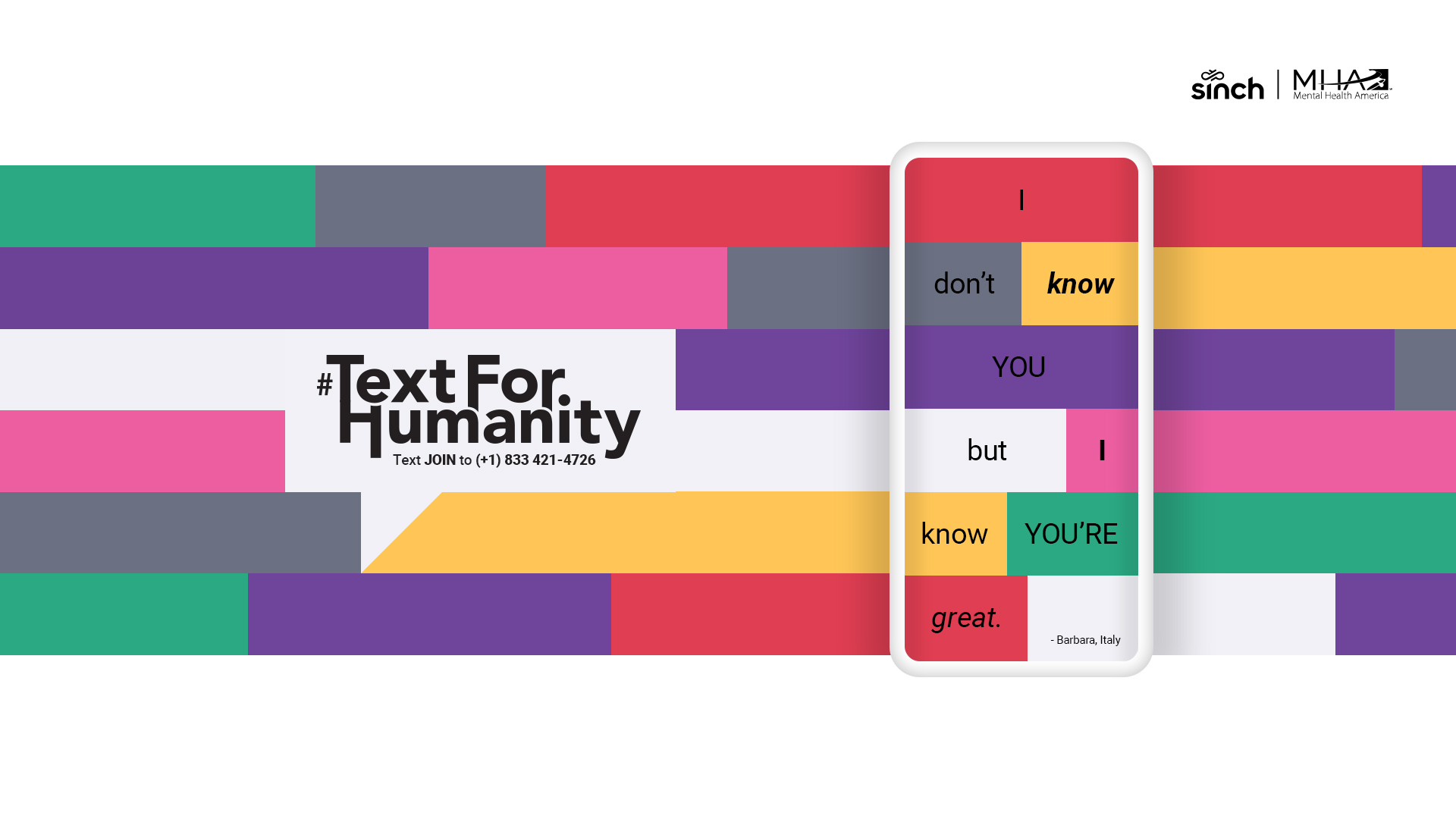 STOCKHOLM, SWEDEN and SEATTLE, WA, JANUARY 16, 2020 – In response to the spread of online negativity, Sinch AB (publ) has teamed with Mental Health America (MHA) to build the world's first texting switchboard, #TextForHumanity. The new service, developed by Sinch, the global leader in cloud communications for mobile customer engagement, lets people send a positive message to a stranger – and receive one in return.