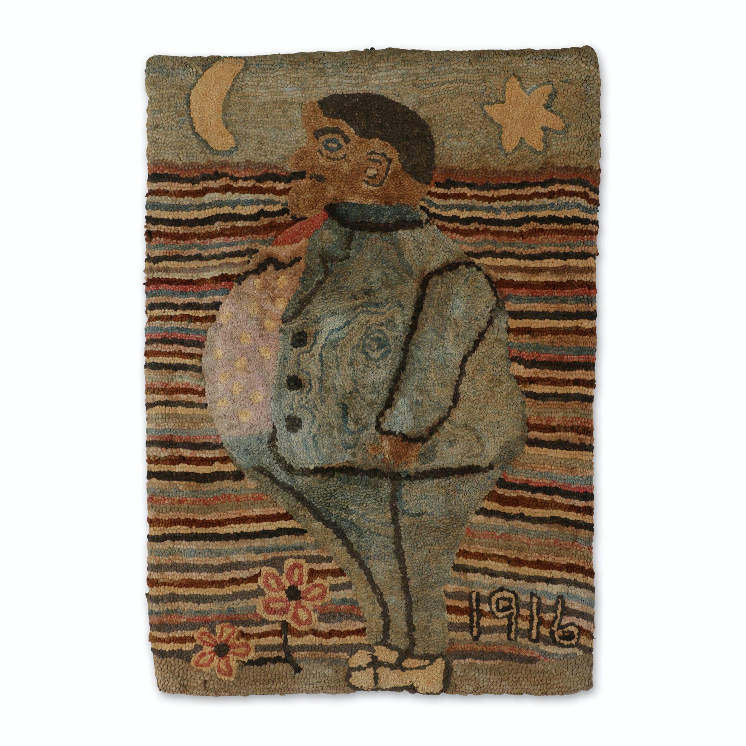 Iconic Canadian “Fat Man” wool and burlap hooked mat dated 1916, possibly Ontario’s most recognizable hooked rug, showing strong colors, 40 inches by 29 inches (est. CA$4,000-$6,000).