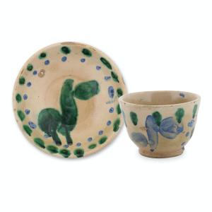 A rare, signed Canadian Wagner Ginger Beer bottle, stamped “Jos Wagner Maker Berlin Ont” just above the lower edge, 8 ½ inches tall, is expected to hammer for $5,000-$7,000. The same estimate has been assigned to a handle-less cup and saucer attributed to The William Eby Pottery (Conestoga, Ontario, 1855-1907), featuring a blue and green slip decoration over a lead glaze.