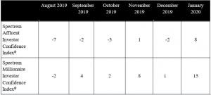 The Spectrem Investor Confidence Indices survey was conducted Jan. 17-22, 2020, just days after the United States and China signed Phase One of a new trade deal, and before U.S. Senate deliberations began in the impeachment trial of President Donald Trump. Any impact from those proceedings on investor sentiment would not be reflected in the January indices.