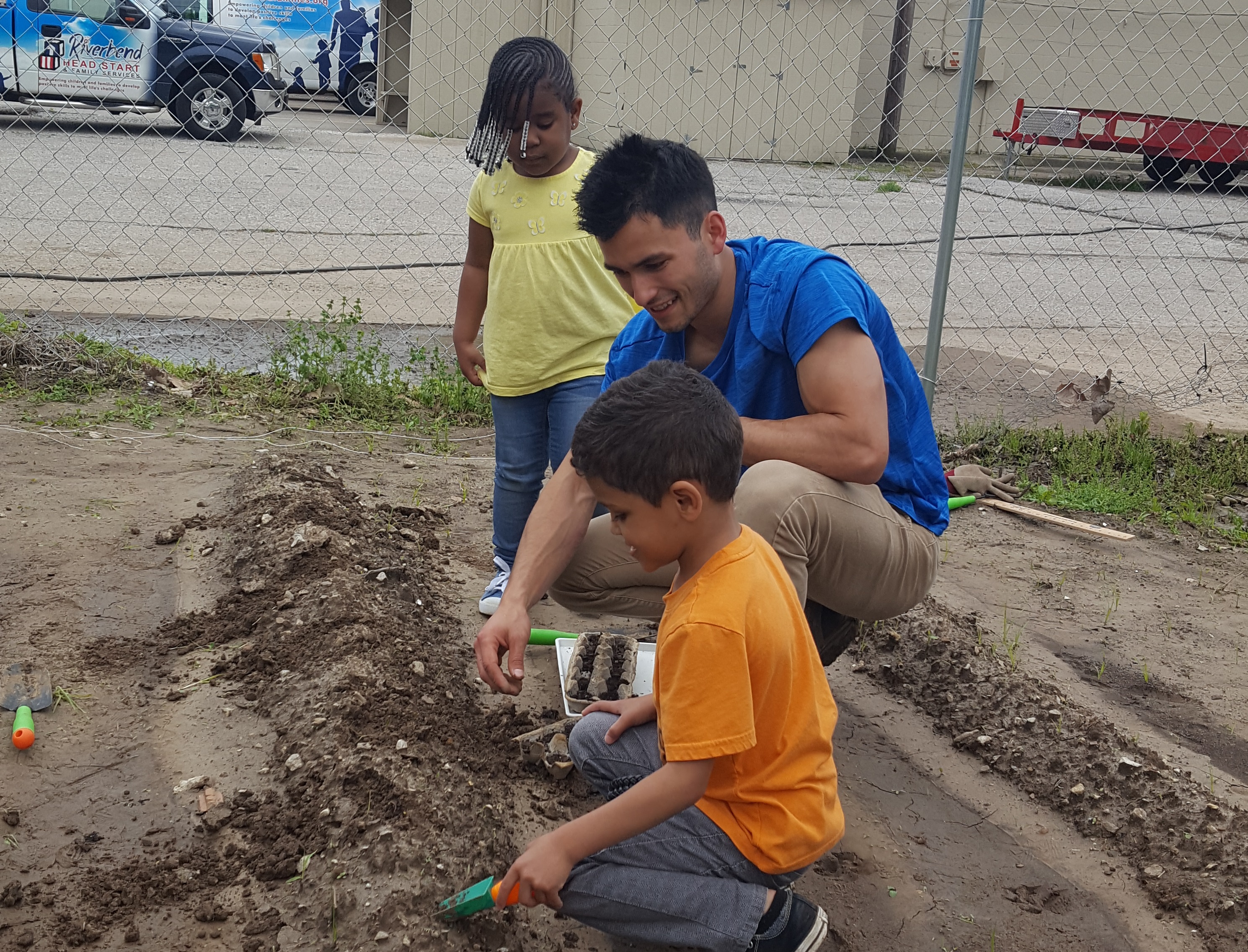 The nutrition education that Riverbend teaches is two-fold, focusing on kids at the center and kids at home. Wanting to include more fresh, home-cooked meals on the menu, Jon began establishing gardens at all of the sites. Both the staff and families are instrumental in the success of the gardens. The children tend and harvest the gardens. The nutrition curriculum from the garden incorporates phonics, math, science, and social studies. Teachers focus on what healthy choices are, what fruits and vegetables do to strengthen our bodies, and lead monthly cooking activities.