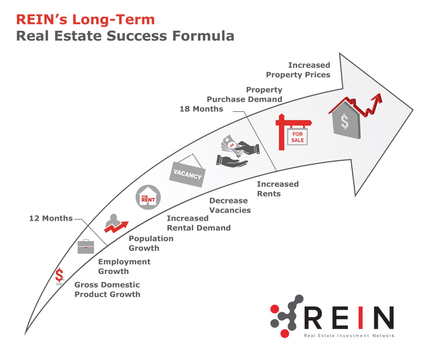 GDP growth is a strong indicator of an economy’s continued growth. Disruptions in GDP growth rates can affect real estate markets within an 18-month period, according to REIN’s Long-Term Real Estate Success Formula.