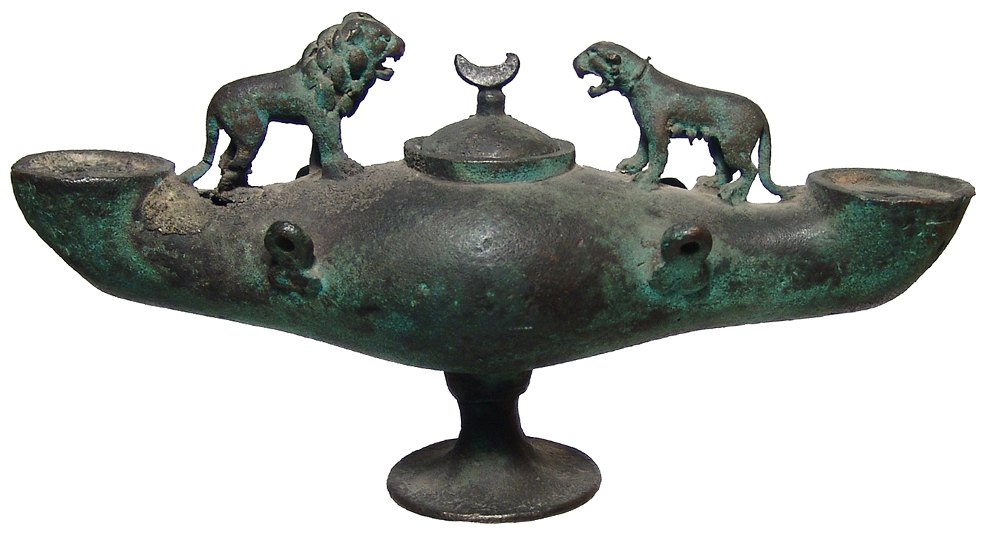 Large Byzantine double-spouted bronze lamp from the 6th or 7th century AD, 9 ¾ inches tall, a lovely example on a flared pedestal foot with an elegant rounded body (est. 7,000-$10,000).