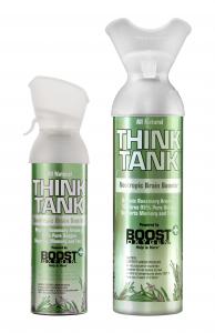 Boost Oxygen has a family of products that includes three (3) sizes of containers that all feature a patented mask design for maximum delivery of the purified oxygen. In addition to the Natural (unscented) version, Boost is the only choice for aromatherapy options of Peppermint, Menthol-Eucalyptus and Pink Grapefruit. THINK TANK represents the first time the product is offered under a different name on the label.