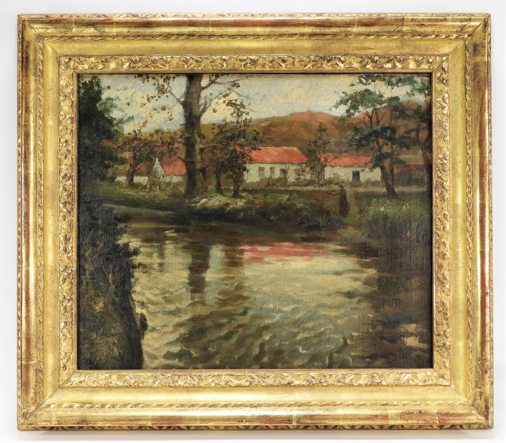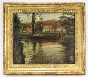 Impressionist oil on canvas painting by Norwegian artist Frits Thaulow (1847-1906), depicting a young woman by the edge of a river with her home in Norway behind (est. $15,000-$25,000).