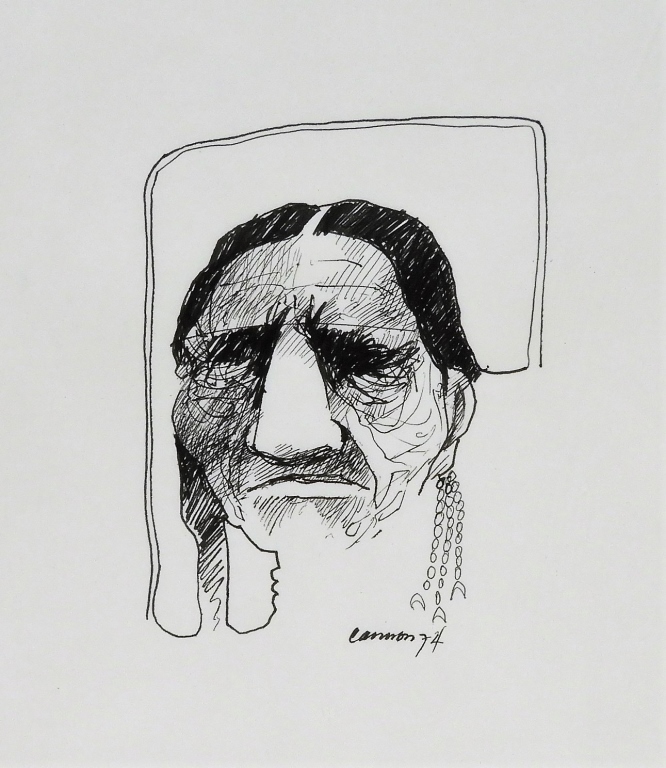 A modern ink drawing by the important 20th century Native American artist T.C. Cannon (1946-1978), depicting a Native American elder with a stern face formed by expressive lines, is estimated at $1,000-$1,500. Cannon attended the Institute of American Indian Arts in Santa Fe, studying with Fritz Scholder. Cannon portrayed Indians of distant past, placed in today's world.