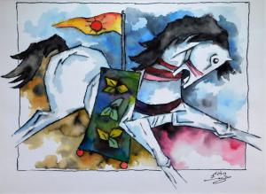 Watercolor painting by Maqbool Fida Hussain of a leaping white horse with open mouth draped with a green saddle blanket and carrying a flag with the image of a sun (est. $8,000-$12,000).