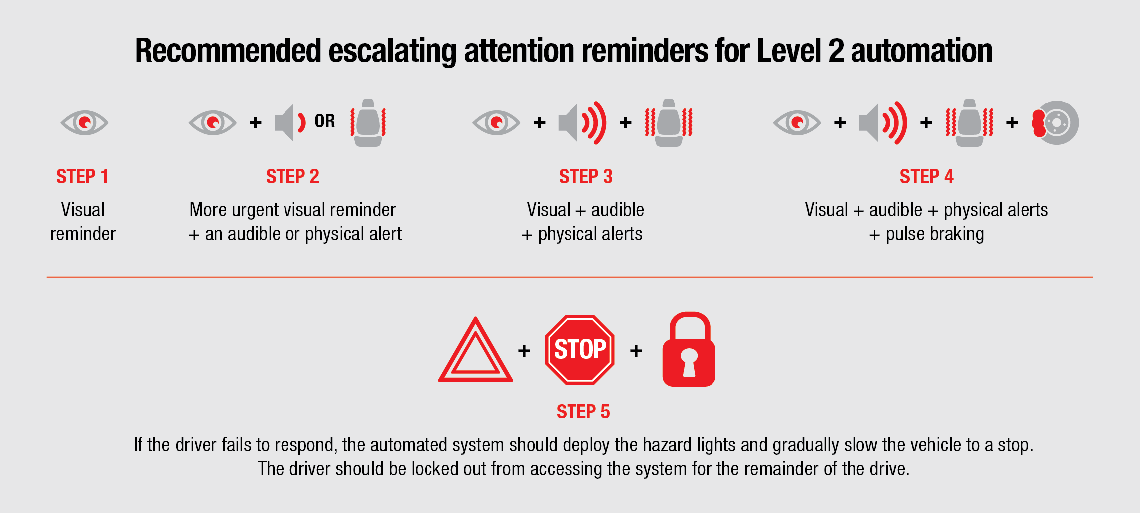 If the driver still fails to respond, the system should deploy the hazard lights and gradually slow the vehicle to a stop — though a design capable of first moving the vehicle onto the shoulder would be preferable. The driver can interrupt this safe stop procedure at any time by resuming control over the throttle or brake pedal and steering. However, the driver should be locked out from accessing the Level 2 system for the remainder of the drive anytime that the safe stop procedure has been triggered or a maximum number of attention reminders has been reached.