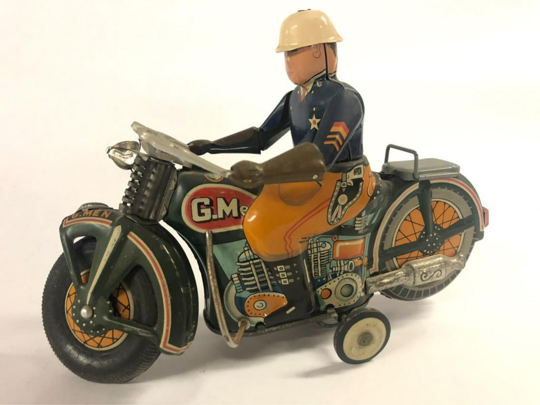 • A G-Men tin litho friction toy motorcycle, 10 inches long, made in Japan by Hadson and featuring a steerable hard rubber front wheel and G-Men graphics (est. $300-$600).