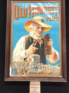 Framed advertising poster for Old Honesty plug tobacco (“Never Varies, Always the Best”), depicting a bearded man cutting off a piece of plug, plus a plug tobacco bag (est. $100-$200).