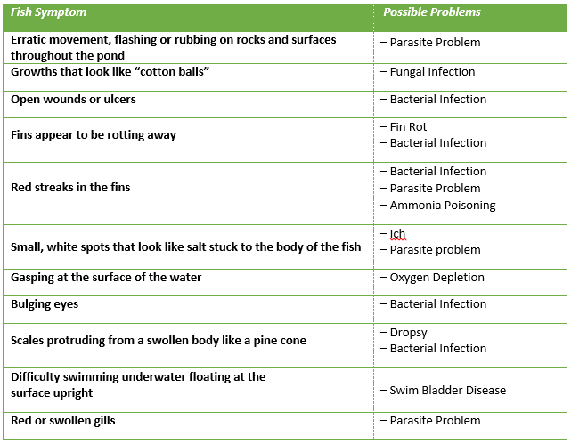 Use the table below to assist you with treating common problems that may arise with fish in a water garden.