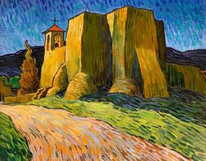 Oil on canvas painting by Robert Daughters (N.M., Az., 1929-2013), titled Ranchos Chapel, Taos measuring 28 inches by 31 ½ inches framed ($15,990).