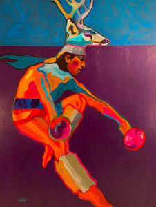 Many of John Nieto’s (Tex., N.M., 1936-2018) works feature Native Americans from the Southwest, including this 20 inch by 24 inch electric acrylic on canvas, Deer Dancer ($10,455).