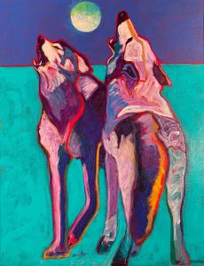 More than 20 paintings by John Nieto (Tex., N.M., 1936-2018), another painter heavily influenced by the Southwest, came up for bid. Nieto’s work employs vibrant primary colors to capture the people and wildlife of the American Southwest. His acrylic on canvas titled Deer Dancer, portraying a Native American, 42 inches by 31½ inches (framed) sold for $10,455, over two times the estimate. Another piece by Nieto, a diminutive (22 inches by 17 ½ inches framed) acrylic on canvas showing howling wolves titled Lunar Duet (Wolfs), brought $5,412.