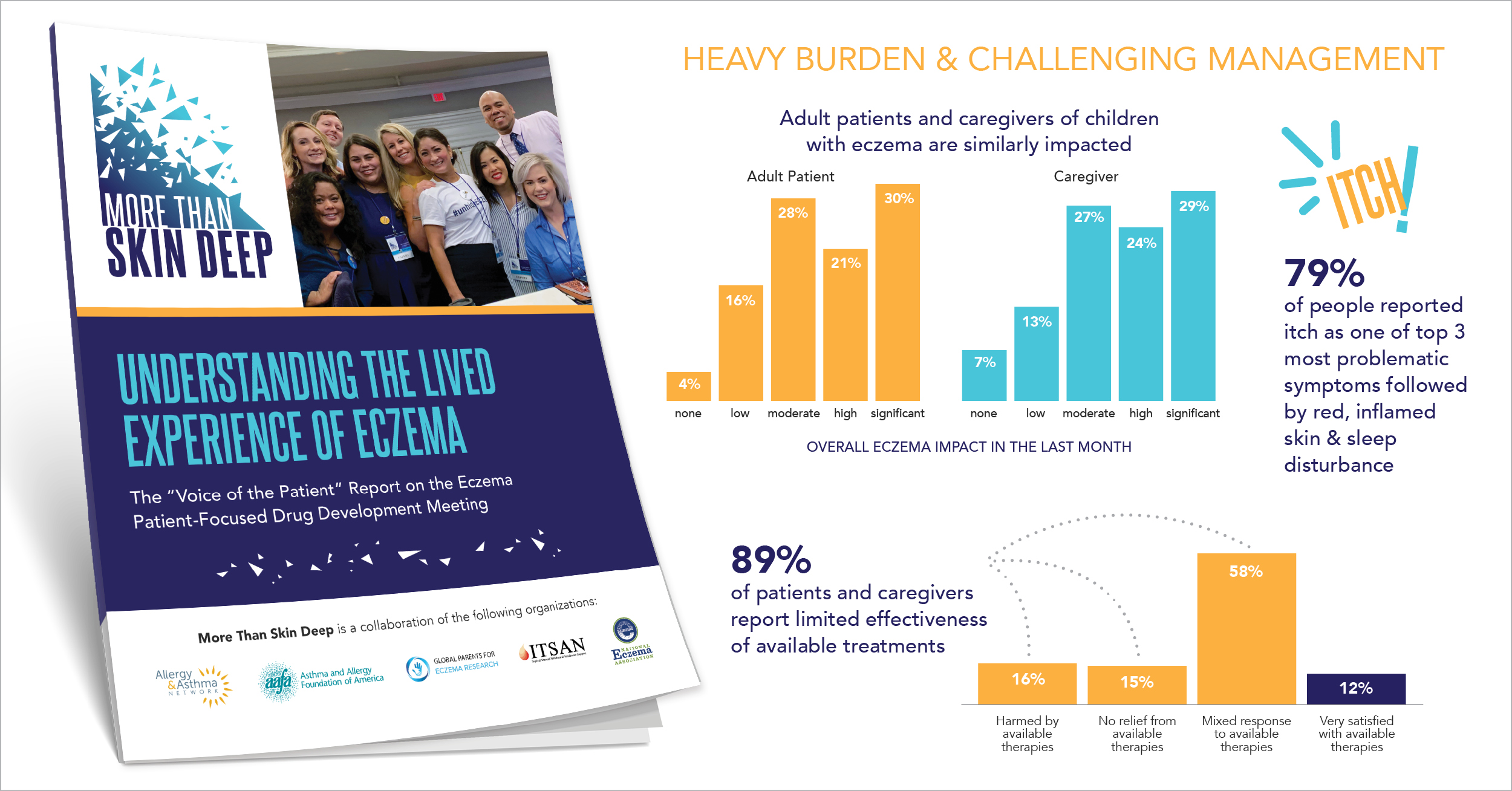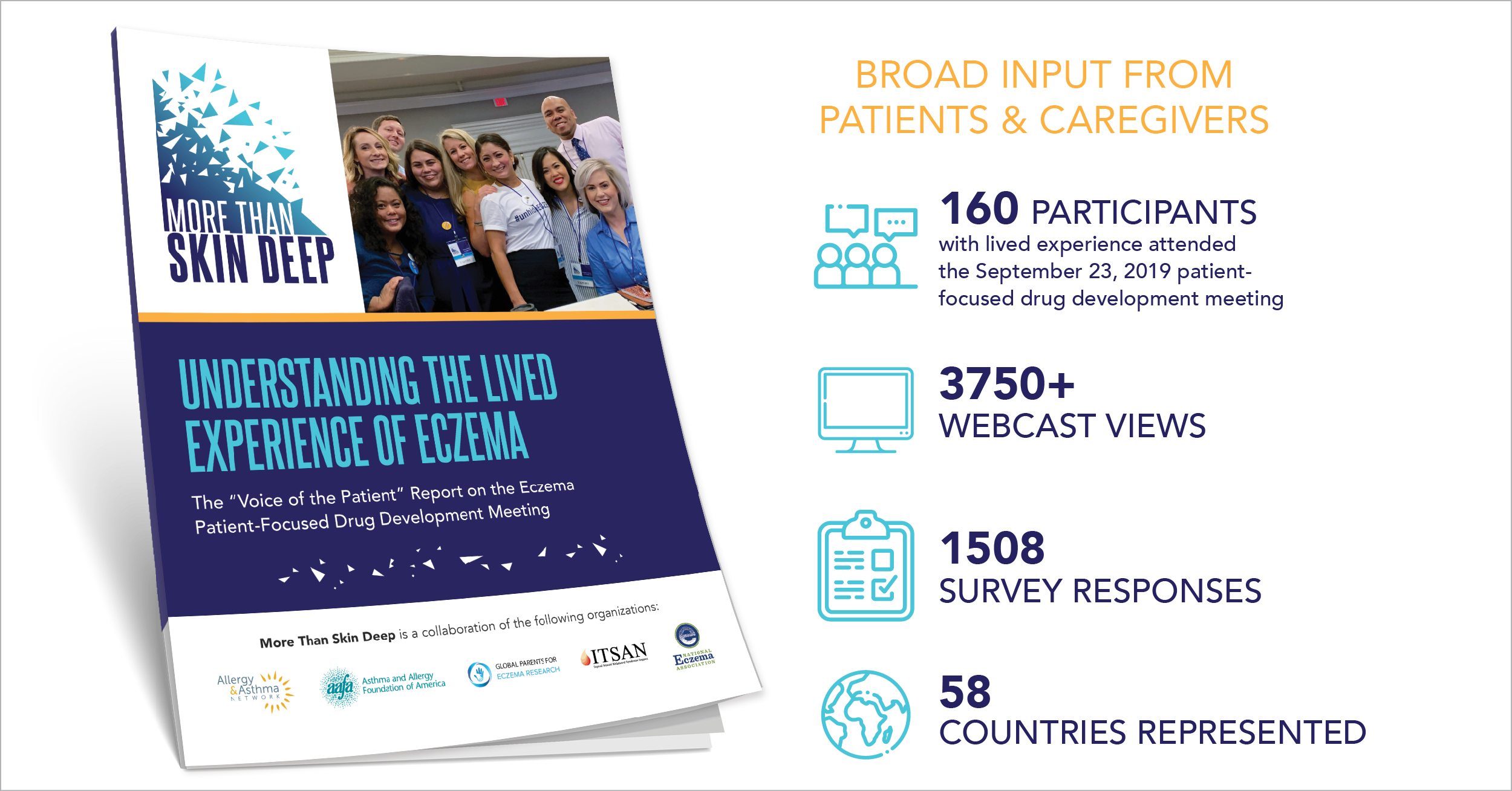 Washington, D.C., March 18, 2020 (GLOBE NEWSWIRE) -- Today, five organizations jointly release the “More Than Skin Deep” Voice of the Patient report summarizing outcomes from a September 2019 patient-focused drug development meeting – a novel effort to understand and share the lived experience of patients and caregivers affected by atopic dermatitis, the most common form of eczema. For the first time ever, adults and children living with eczema and their family members shared riveting descriptions of symptom burdens, challenges managing the disease, and treatment expectations with U.S. Food and Drug Administration (FDA) regulators, drug developers, and researchers. This comprehensive, full-color report shares testimony, data, and photos from the 160 in-person participants, 1,508 respondents to the companion survey, and thousands of virtual attendees participating via webcast. The survey is one of the largest surveys of the eczema community to date.