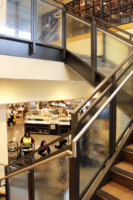 Bendheim products were used in the store’s mezzanine-level Market Café and along a staircase that leads to the Bar, also on the mezzanine level. The café features EcoGlass™ Gothic Textured Glass. The hybrid glass along the staircase is a custom combination of Bendheim’s Pale Grey Diamond Wire Laminated Glass and VintageWire™ Gothic Laminated Architectural Glass. It is also used inside the café.