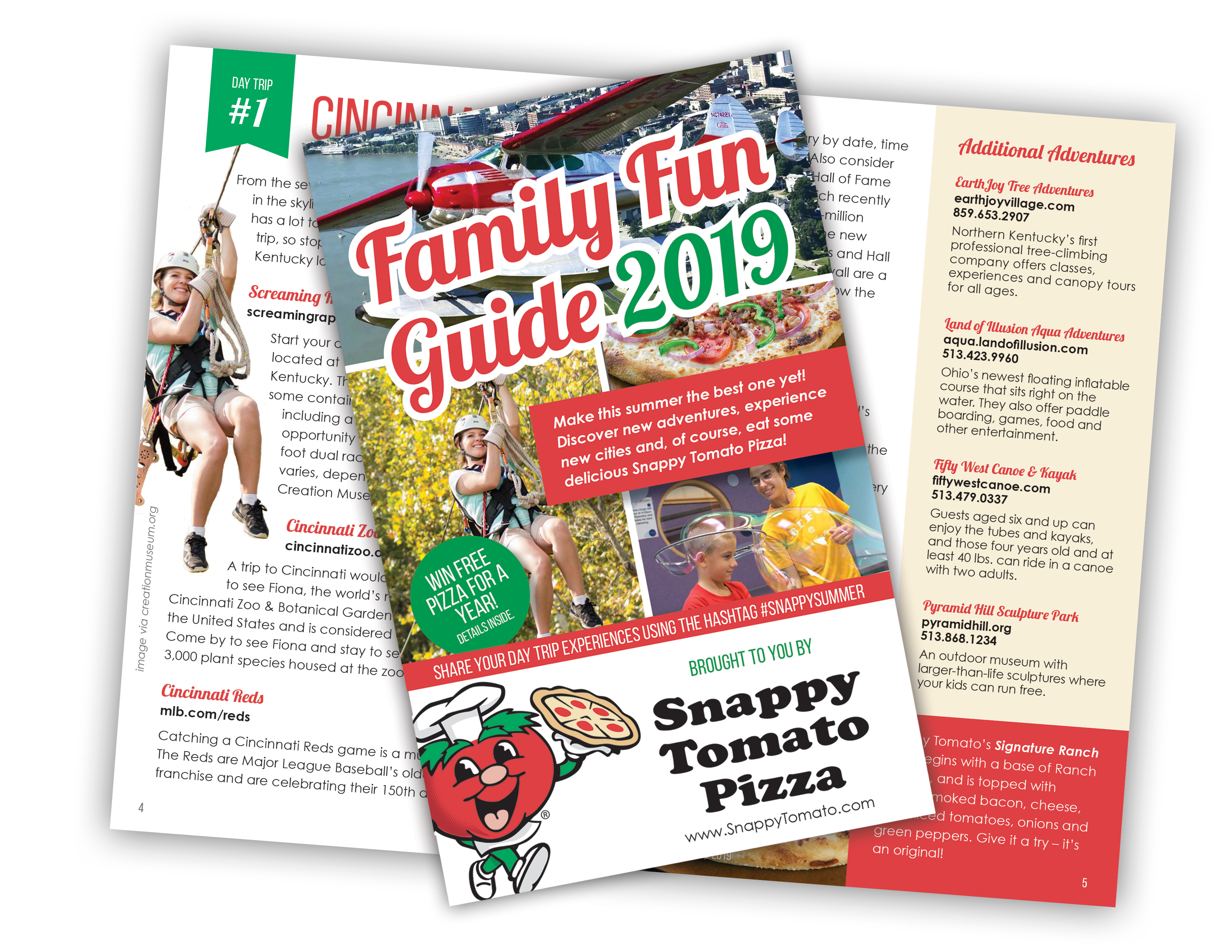 The Snappy Tomato Pizza Family Fun Guide 2019 campaign was developed to encourage patrons to travel to new destinations, try a different Snappy Tomato Pizza location and have some family fun. The free 16-page guide was piled high with numerous day trip adventures, activities and attractions. The guide provided an opportunity to highlight and support businesses in the communities surrounding our Snappy Tomato Pizza franchise locations. Seventeen regional Indiana attractions were featured in the Family Fun Guide 2019, at no expense to them. Fifty thousand printed guides were distributed across forty-eight Snappy Tomato Pizza locations, including seven stores in Indiana from Bright to Rising Sun. The guide was promoted online, in-store and via radio advertising from Columbus, Indiana to Knoxville, Tennessee and Cincinnati, Ohio to Louisville, Kentucky. The Family Fun Guide also included a complete map of all the current Snappy Tomato Pizza locations, an introduction to franchising opportunities and exclusive coupon offers.