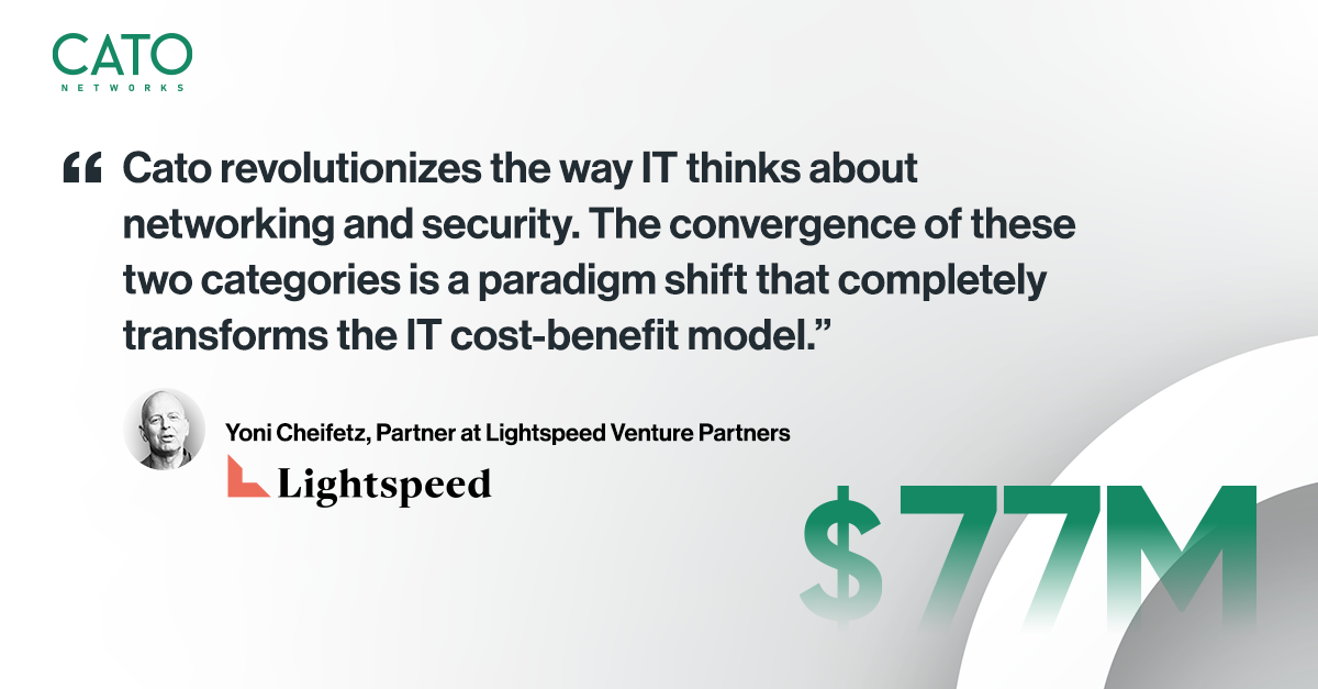 "Cato revolutionizes the way IT thinks about networking and security. The convergence of these two categories is a paradigm shift that completely transforms the IT cost-benefit model," says Yoni Cheifetz, Partner at Lightspeed. "It's why Cato routinely displaces legacy telco services and appliance-based solutions in enterprises of all sizes. We believe Cato is uniquely positioned to disrupt the global market for security, networking, and access with an architecture that is unmatched by any other solution available today.”
