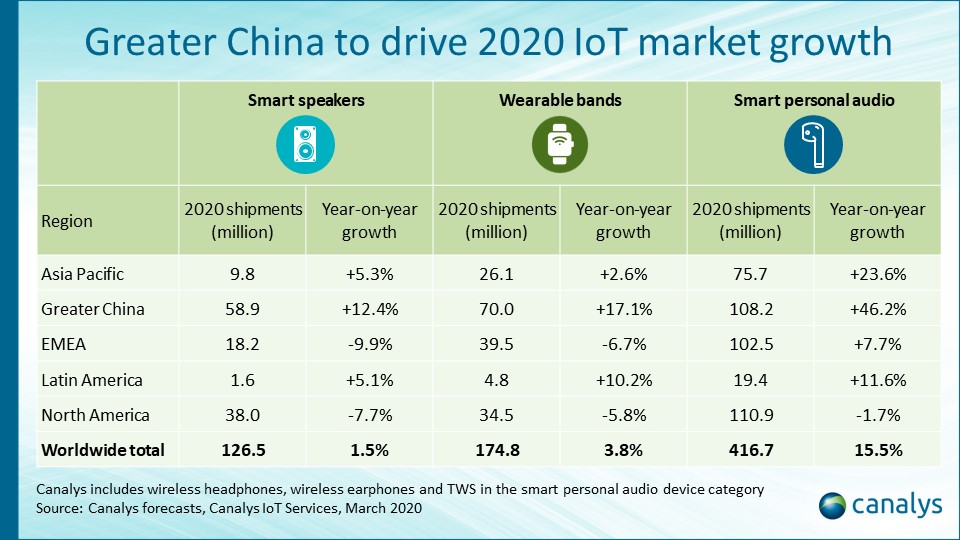 Canalys forecasts that shipments of wearable bands, smart personal audio devices and smart speakers will grow 9.8% to reach 718.0 million units in 2020