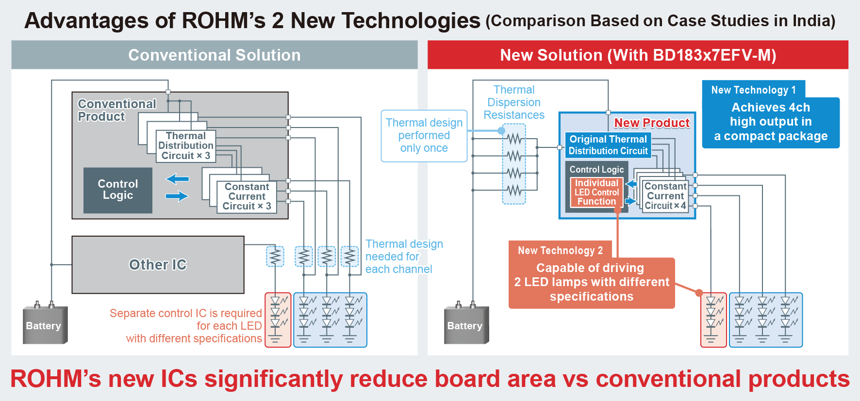 In response, by analyzing the demands in India, the largest market for 2-wheeled vehicles, ROHM was able to develop LED drivers that solve these issues utilizing 2 new technologies. The BD183x7EFV-M (BD18337EFV-M / BD18347EFV-M) series incorporates a proprietary thermal dissipation circuit and individual LED control function specifically developed to significantly reduce board area along with application design load for LED lamps.