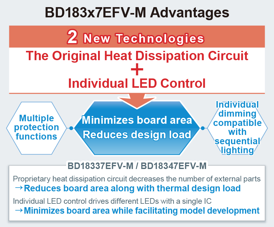 The BD183x7EFV-M (BD18337EFV-M / BD18347EFV-M) series leverages thermal dissipation circuit and individual LED control function, that significantly reduces both board area and application design load for LED lamps.