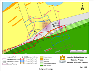 Drilling was undertaken to evaluate areas of high historical gold intersections (6.9 g/t Au over 3.8m and 5.1 g/t Au over 2.8m), as well as geophysical/geological targets favourable to gold concentration in the area. Of importance was the intersection, in drillhole O-20002, of an intense deformation and alteration structure containing 1% to 15% pyrite, minor pyrrhotite and occasional chalcopyrite and tourmaline over 155.0 metres of core length. The new drilling is geologically similar to areas of historical gold intersections returned from the property. The intensity of the structural deformation, favourable alteration and sulphide mineralization observed has led Imperial staff to interpret that the area is highly prospective for concentration of gold. Samples from this hole are currently being processed by AGAT Labs of Mississauga, Ontario, with results anticipated for delivery towards the end of April 2020.