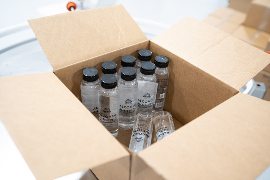 The Pacha team is using gallon drums and repurposing inventoried packaging to combat plastic packaging shortages throughout the US. Hospitals across Nebraska, New York and Florida are scheduled to receive hand sanitizer donations by the end of this week.