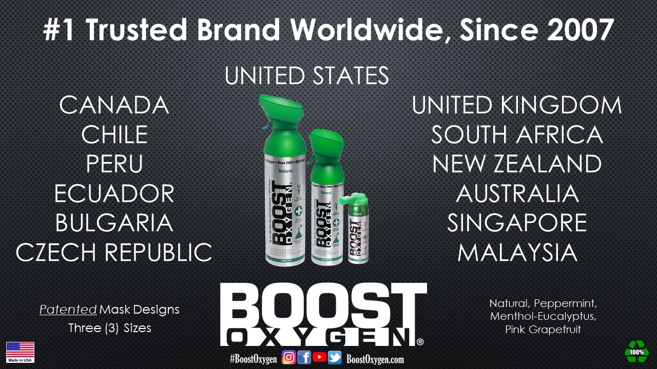 Boost Oxygen is the #1 trusted brand of portable, lightweight 95% pure oxygen; launched in 2007. Based in Milford, Connecticut, Boost Oxygen is a Made in the USA product, available at retailers nationwide and exported worldwide. For more information, images and studies about the benefits of oxygen, visit the website: BoostOxygen.com. Follow Boost on social media: Facebook: @BoostOxygenUSA, Twitter: @BoostO2, Instagram @boostoxygen, Pinterest: @BoostOxygenUSA and the YouTube Channel: Boost Oxygen.