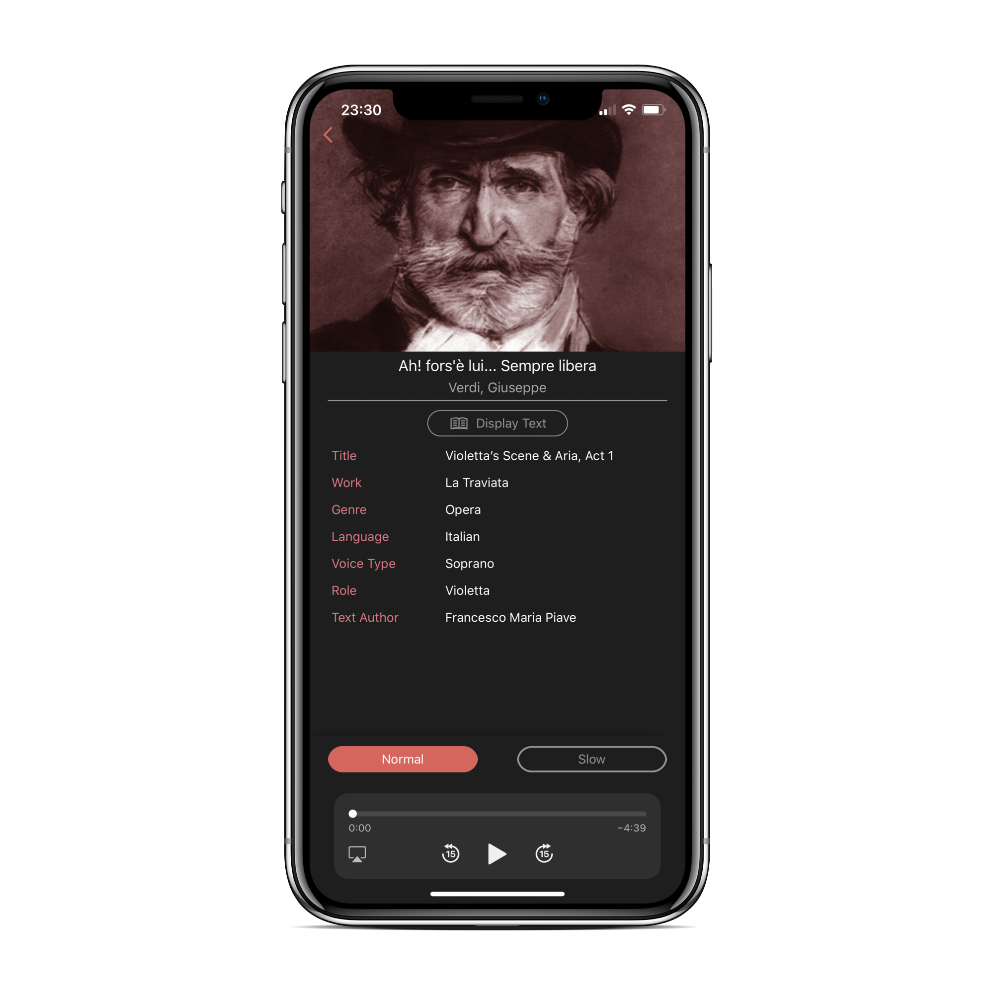 Created by singers for singers, DictionBuddy offers instructional audio tracks of texts to over 650 opera, oratorio arias, and art songs in Italian, French, German, Russian, Czech, English, and Latin. Each text is read by a native speaker and classical singer who is an expert in the differences between spoken and lyric diction, and who understands the challenges involved in enunciating a text while singing. Texts are available in two choices of speeds: normal, and slow, and the listener can pause, fast forward, stop, or backtrack in increments of 15 seconds.