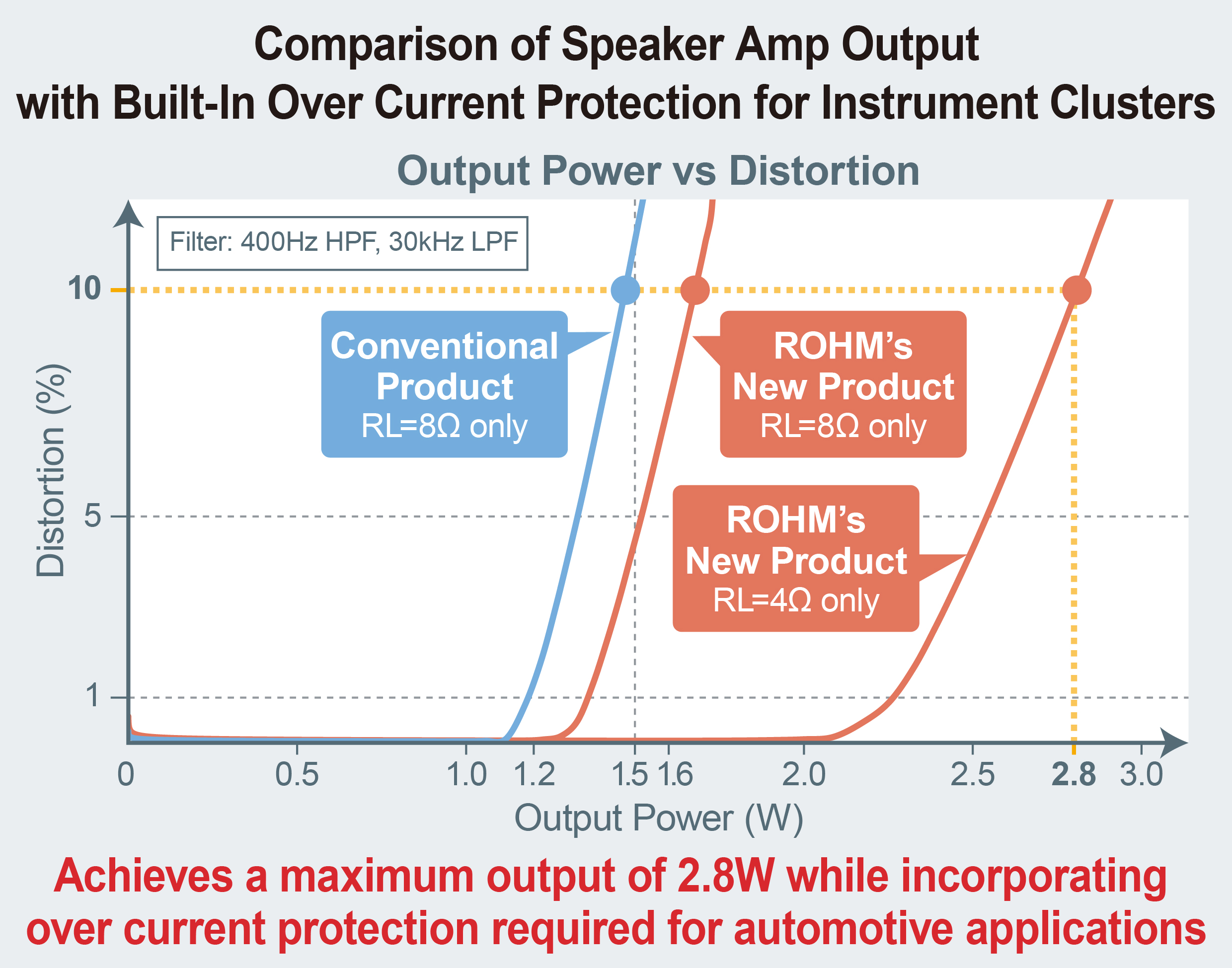 In contrast, ROHM’s new over current protection circuit eliminates the need to limit the output by preventing waveform distortion even at high output. This allows the BD783xxEFJ-M series to provide over current protection from output shorts which was difficult to achieve in the past in combination with high output (2.8W max. at 4Ω load and 10% distortion).