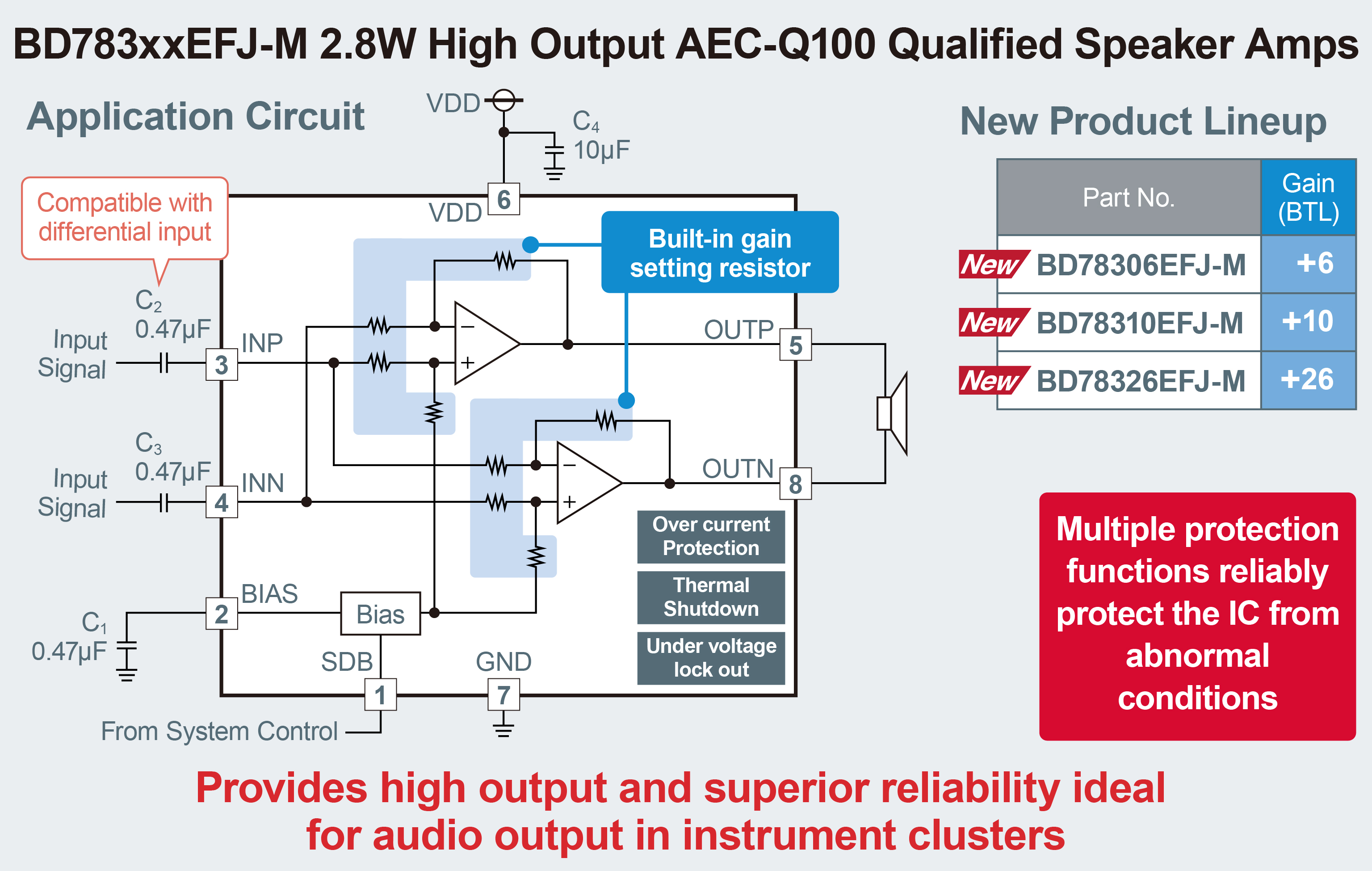 ROHM developed the BD783xxEFJ-M series for vehicle clusters - requiring various sound outputs at high volume, including warning sounds, turn signals, welcome tones and voice guidance. Also, adopting a new type of over current protection (OCP) circuit provides protection against output shorts (damage due to accidental terminal contact) to deliver high 2.8W output that was difficult to achieve in the past, making it possible to deliver high 2.8W output. In addition to over current protection, built-in thermal shutdown and under voltage lock out (UVLO) ensures high reliability protection against abnormal conditions.