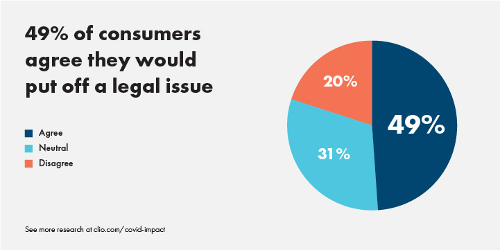 The data shows that one reason firms are seeing slowdown has to do with consumer attitudes toward legal problems. Almost half (49%) say that if they had a legal issue, they would very likely delay reaching out for legal help until after the coronavirus pandemic has subsided, while an additional 22% reported that they were under the impression that lawyers have ceased offering legal services completely.