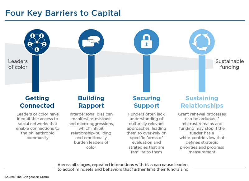 The article draws from interviews with 50 sector leaders, including nonprofit executives of color, philanthropic staff, and leaders working to address this issue, and builds on research of others from across the sector focused on racial equity, offering fresh data. Bridgespan and Echoing Green researchers observed that leaders of color are hitting four barriers spanning every stage of fundraising. They include: getting connected to funders; building rapport with them; securing support for their organizations; and, sustaining the relationship once launched.