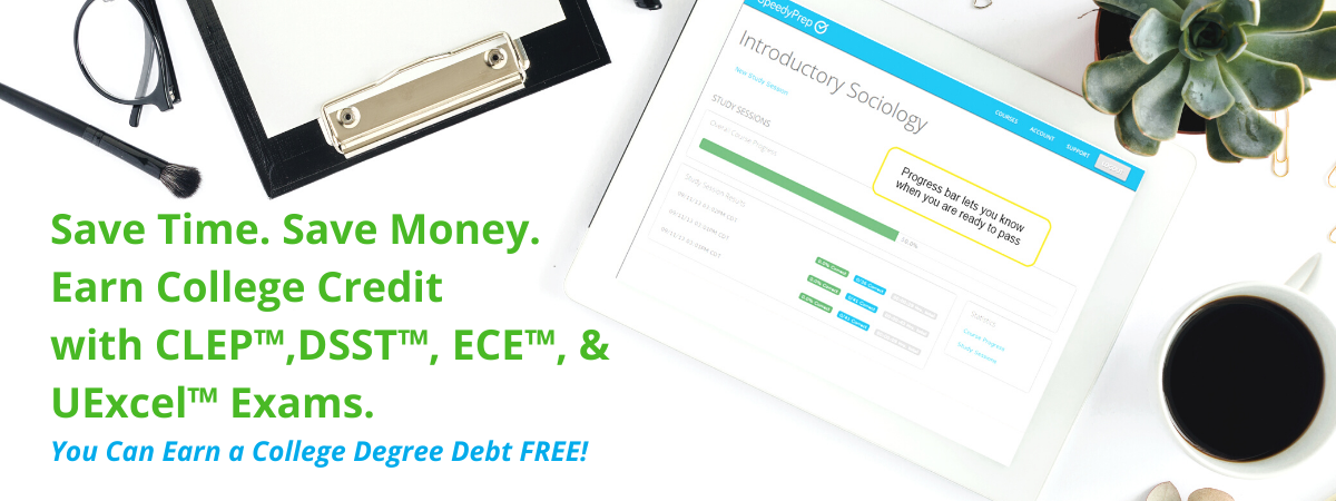 Credit by examination is often used to complete general education courses like English, History, Math, and others. This reduces the cost of a student's degree and the time it takes to complete a college course. Students can save time, save money, and graduate sooner by testing out. They also increase their chances of graduating from college without debt. SpeedyPrep test prep backs all its products with a 100% money-back guarantee for the first time testing success. SpeedyPrep provides a free eBook "Earn College Credit Wherever You Are" to help students understand how testing out saves time, saves money, & helps reduce college debt.
