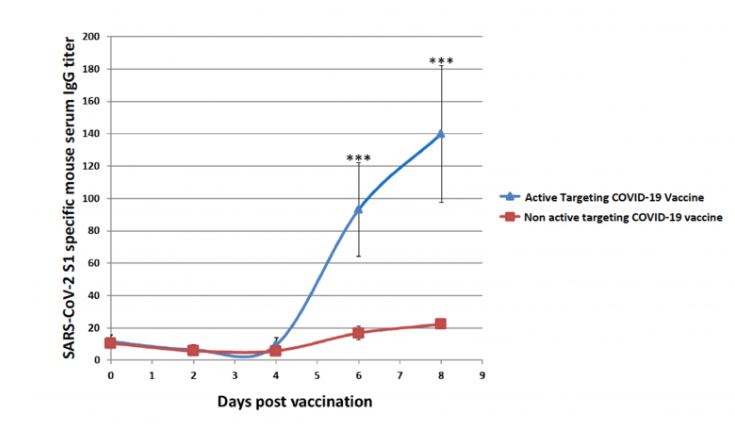 Figure 1. Generation of Anti-SARS-CoV-2 Spike Protein IgG Antibodies: SARS-CoV-2 S1 specific IgG was measured following vaccination in mice with Active Targeting COVID-19 Vaccine (AVI-205). Rapid and robust immune response was observed in less than a week.