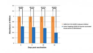 Specific SARS-CoV-2 S1-hACE2 binding was inhibited in vitro using serum collected from mice vaccinated with Active Targeting COVID-19 Vaccine (AVI-205). The inhibition of S1-hACE2 binding was observed in as early as 6 days post vaccination.