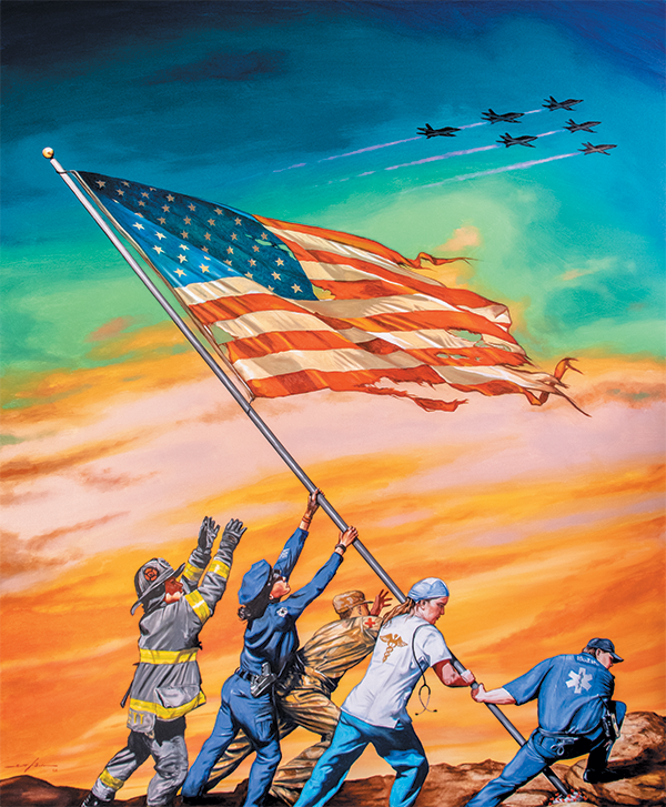 Utilizing a vast array of colors and shades, Sunrise: A Tribute to First Responders depicts the heroes of this pandemic - a firefighter, police officer, member of the military, health care worker and an EMT - raising a tattered American flag at sunrise, as the bottom of the flagpole jams the coronavirus into the ground.