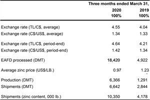 The Turkish JV processed 18,420 tonnes EAFD in Q1 2020 compared to 4,922 tonnes in Q1 2019. Production of concentrates was 6,366 dry metric tonnes (“DMT”) in Q1 2020 compared to 1,291 DMT in Q1 2019. The lower 2019 production reflects the closure of operations at the end of January 2019 for the reconstruction project and the continued ramping up process in Q1 2020.