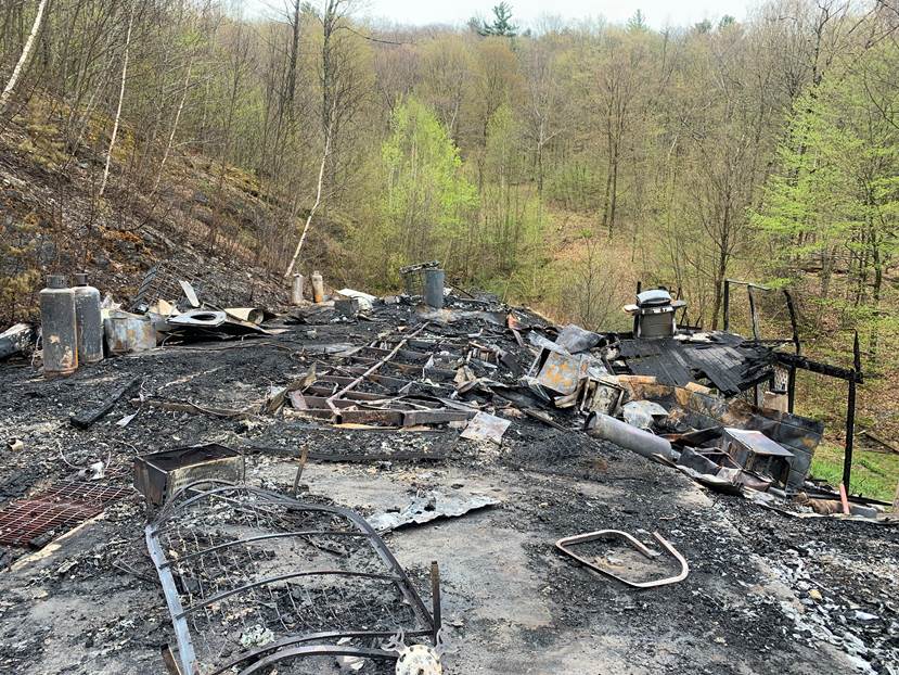 On May 16, 2020 at approximately 1251 PM, the Middletown Springs Fire Department responded to 4000 Saw Mill Hill Road for a report of a structure fire at a remote camp. Upon arrival, firefighters encountered a fully involved structure fire in the single-story camp. They noted most of the camp structure had already been consumed by the fire prior to their arrival. They then began an exterior attack of the fire however despite their efforts they were unable to save the structure from being completely consumed by the fire.