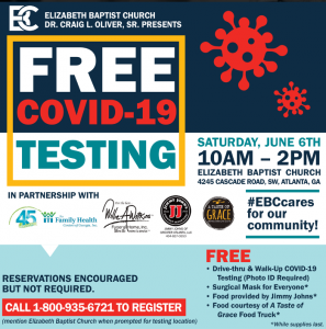 Rev. Dr. Craig L. Oliver Sr. and the Elizabeth Baptist Church will undertake free COVID-19 testing at their Atlanta location at 4245 Cascade Rd Atlanta, Georgia on June 6th beginning at 10:00amuntil 2:00 pm and will provide free, 'Taste of Grace' food to all testing participants.