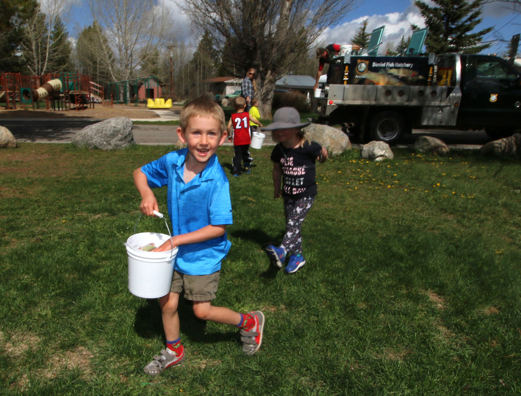 Pinedale - The Daniel Fish Hatchery recently stocked about 120 catchable-sized Colorado River cutthroat trout in the Pinedale Kids Pond at Boyd Skinner Park in Pinedale. To say that Daniel Fish Hatchery Superintendent, Bret Barngrover, had the help of some very enthusiastic helpers would be an understatement. About 20 preschoolers from the Children’s Discovery Center in Pinedale squealed with excitement as they hauled buckets of fish to the water’s edge to turn them loose.