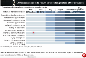 As we begin the month of June, fewer than half of us will book medical appointments, even essential ones. The same is predicted for grocery shopping in person, eating in restaurants, going into stores to shop, and any activity that involves close contact with others. According to the Bain/Dynasta American Workers Survey taken earlier this month, public caution will remain high, with the majority of Americans continuing to avoid community and large social events, flying on airplanes, using public transportation, and sending children to school or camp. This survey shows, in spite of our need for freedom, most of those who responded are choosing responsible behavior. The truth is, “We are in this together,” and that applies to us all, including the woman on the beach who refuses to wear a mask".