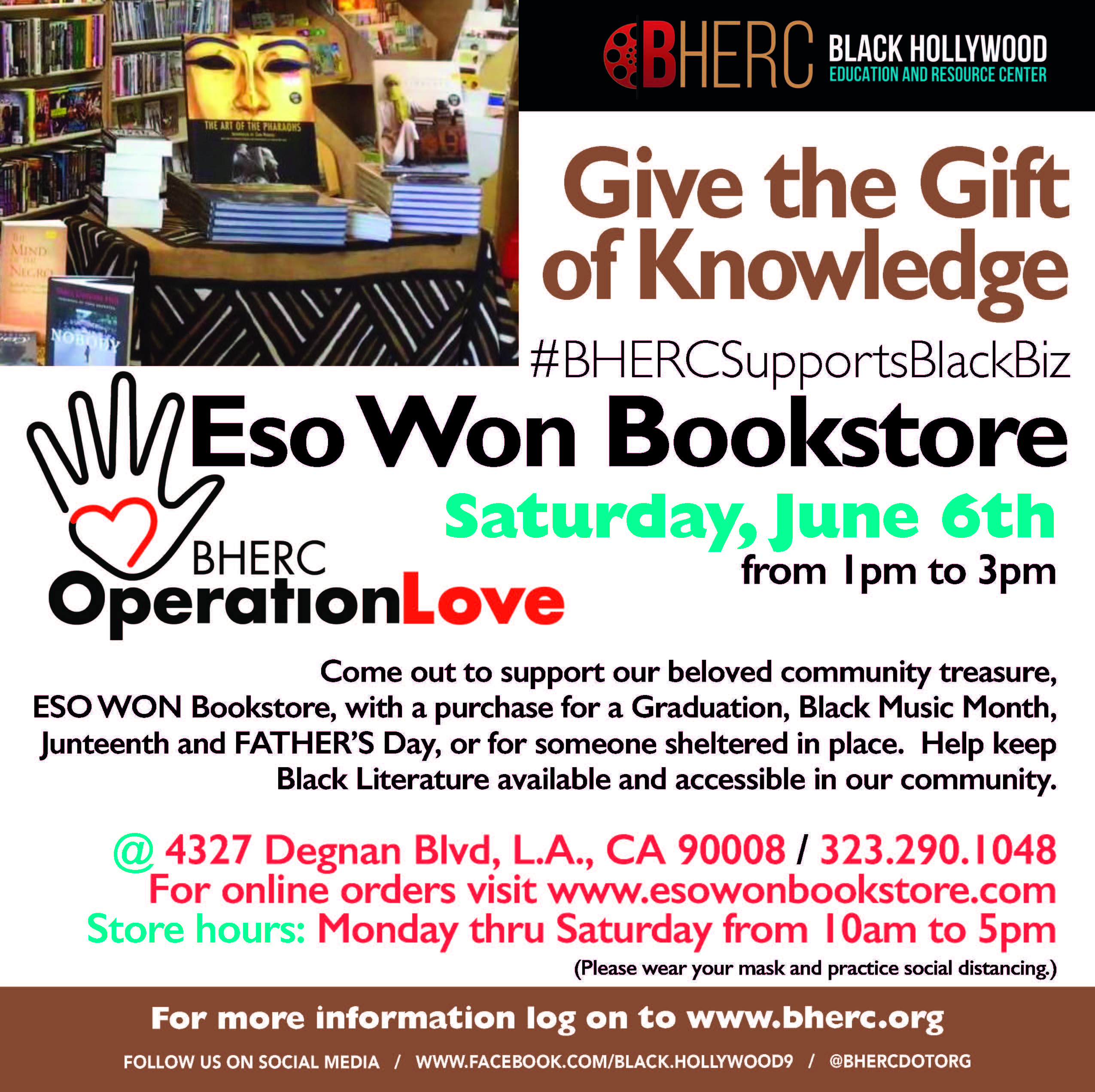 LOS ANGELES, CALIFORNIA, USA, June 3, 2020 /EINPresswire.com/ -- (Los Angeles, CA) The Black Hollywood Education and Resource Center (BHERC) “Operation Love” announced today a call to stimulate community support of African American businesses in South Los Angeles by asking the community to come out in force to support ESO WON Bookstore for an “Operation Love” shopping day Saturday, June, 6, 2020 from 1pm to 3:00:pm. As Los Angeles turn its focus toward economic recovery, this effort to spotlight Black Businesses and their need for support from their community consumers is essential and critical to the revival of the South Los Angeles.