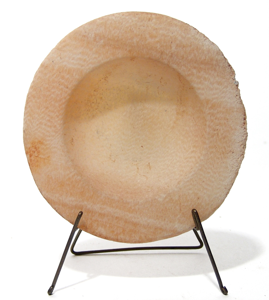 Cypriot alabaster dish from the 4th or 5th century BC, carved from attractive banded stone and featuring a rounded bottom and a wide, flat rim, 3 ½ inches in diameter (est. $600-$900).