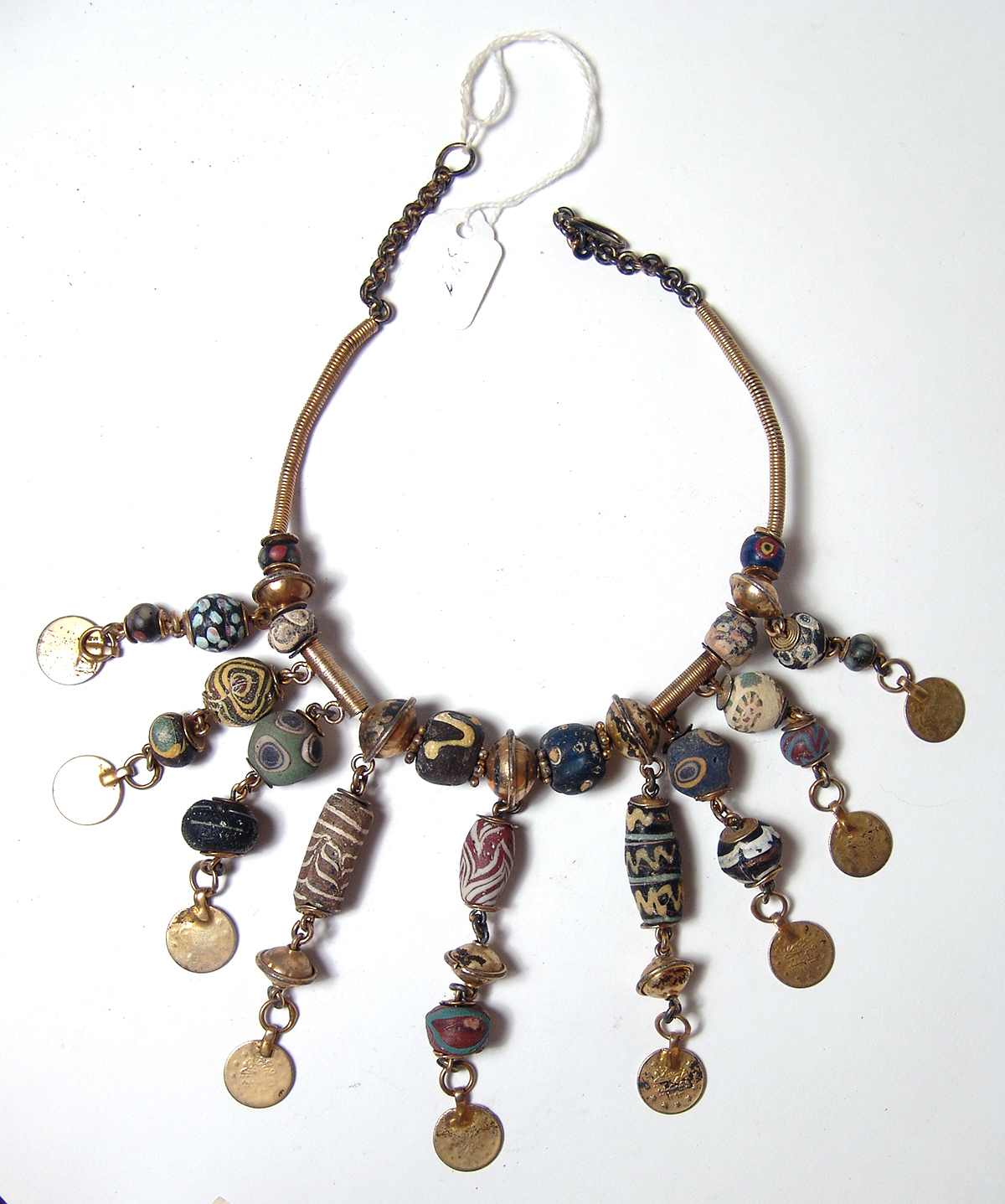 A decorative antique necklace comprised of Islamic glass beads, mostly circa 8th-12th century AD, with the beads strung together with plated coin replicas, brass breads and wire (all probably early 20th century) is expected to bring $700-$1,000; while a Vera Cruz Remojades style figural whistle from Mexico, circa 300 BC-300 AD, 9 inches tall, with the figure shown standing with an elaborate headdress and costume and wearing a central ovoid pendant, should hit $300-$500.
