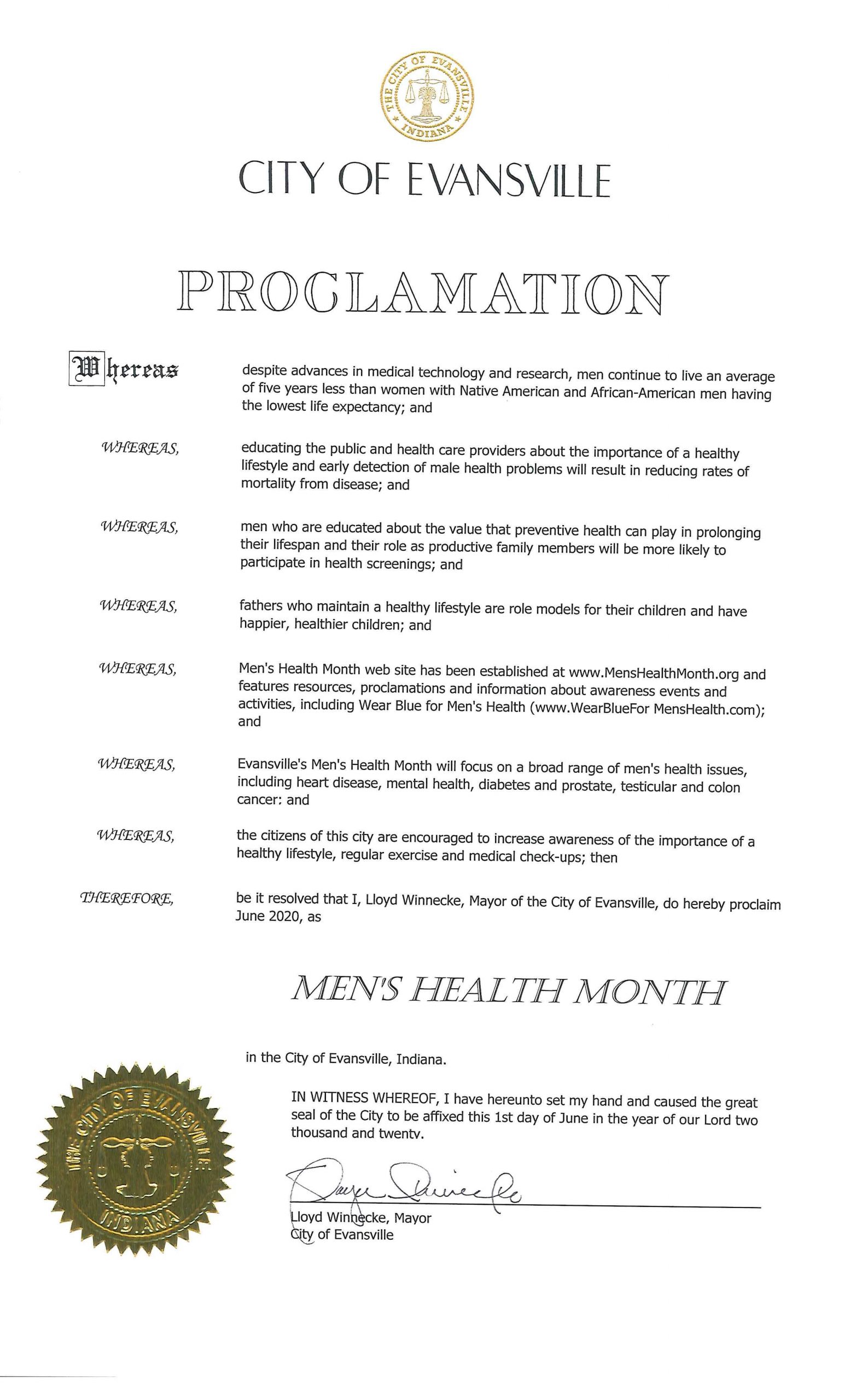 Indiana – The state of Indiana, as well as the cities of Bloomington and Evansville, have issued proclamations celebrating men’s health and fatherhood in June, helping educate men, boys, and their families about disease prevention, timely screenings, healthy lifestyles, and positive family relationships.